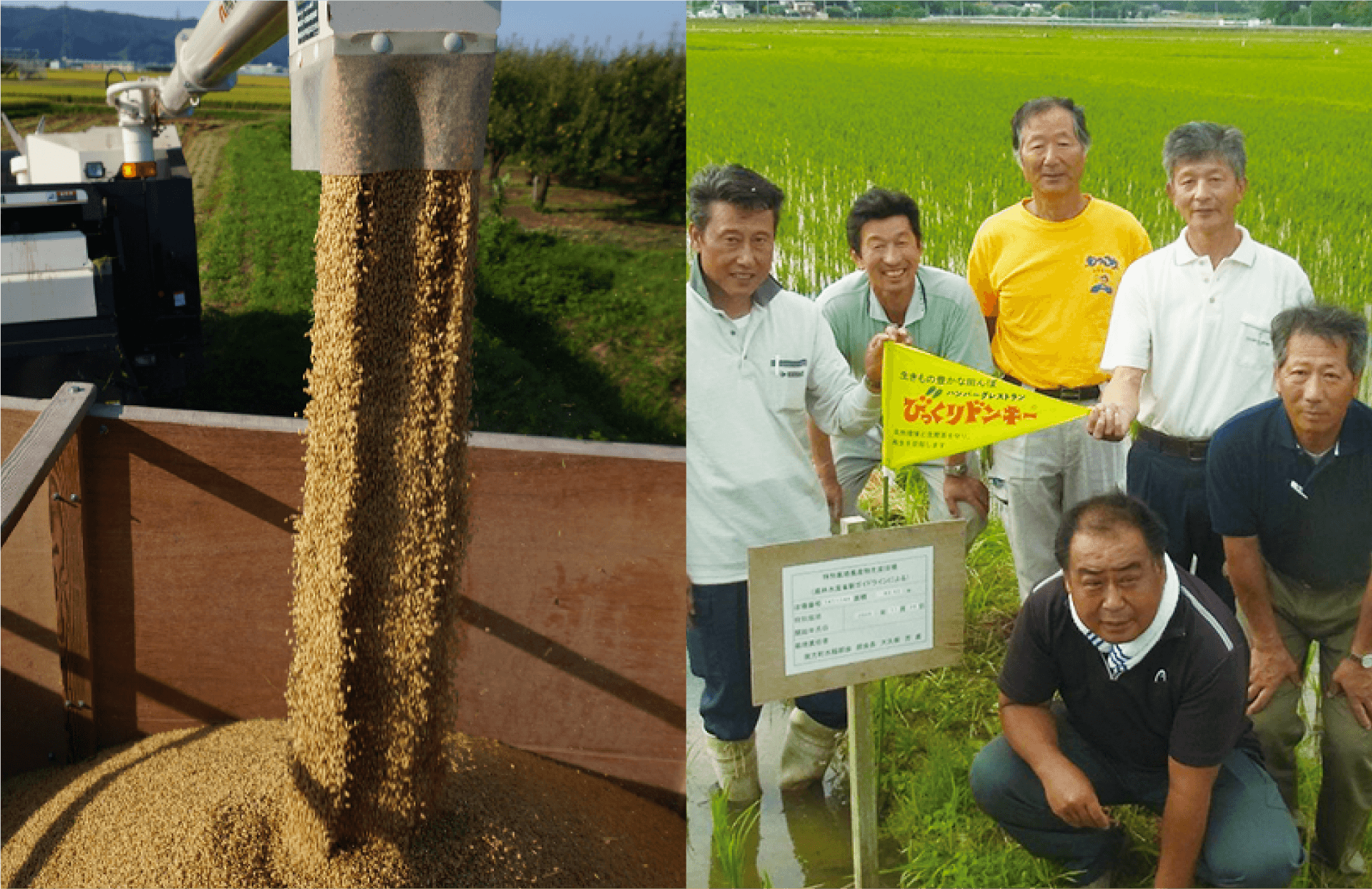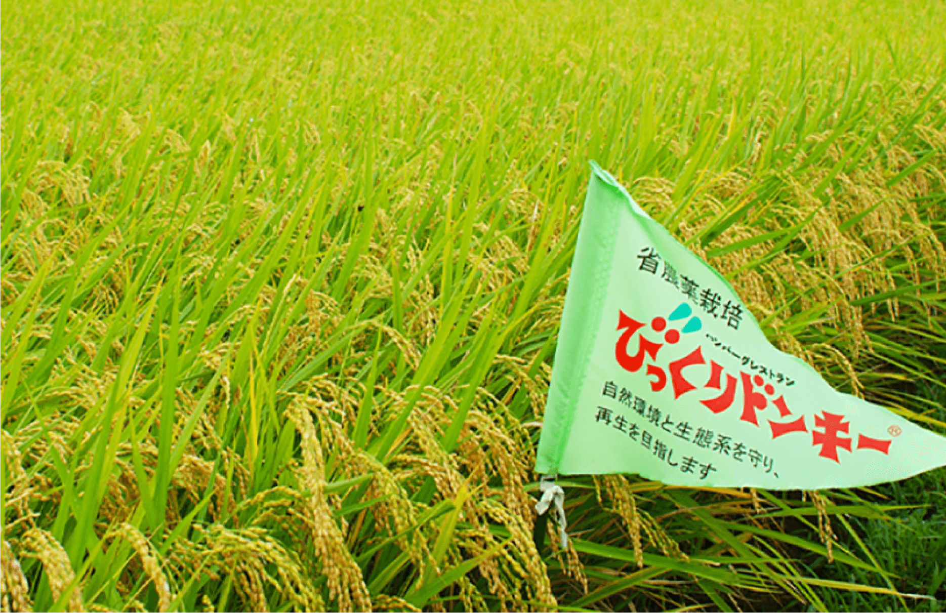 「どの産地の、どの田んぼで、どのように栽培されたものか」がわかるお米を、びっくりドンキーは自信をもってお客様にご提供しています。生産者の皆様は、使用する農薬を減らすため、様々な工夫を凝らしています。