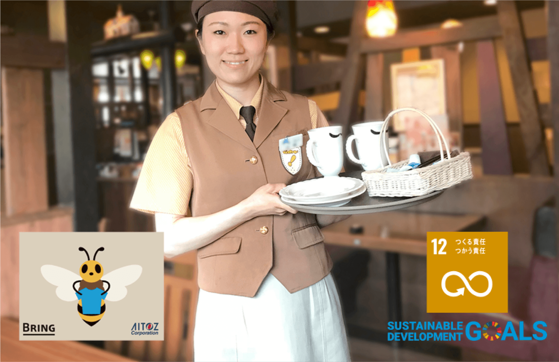 『AITOZ x BRING』とは、使えなくなった使用済みの制服を回収し、そこから新たな繊維、そして新たな衣類へと再生する日本環境設計株式会社とアイトス株式会社の取り組みです。新たな化石燃料の使用を大幅に削減し持続可能な循環型社会を目指すこの取り組みにびっくりドンキーも賛同し、全店・全事業所で導入しています。