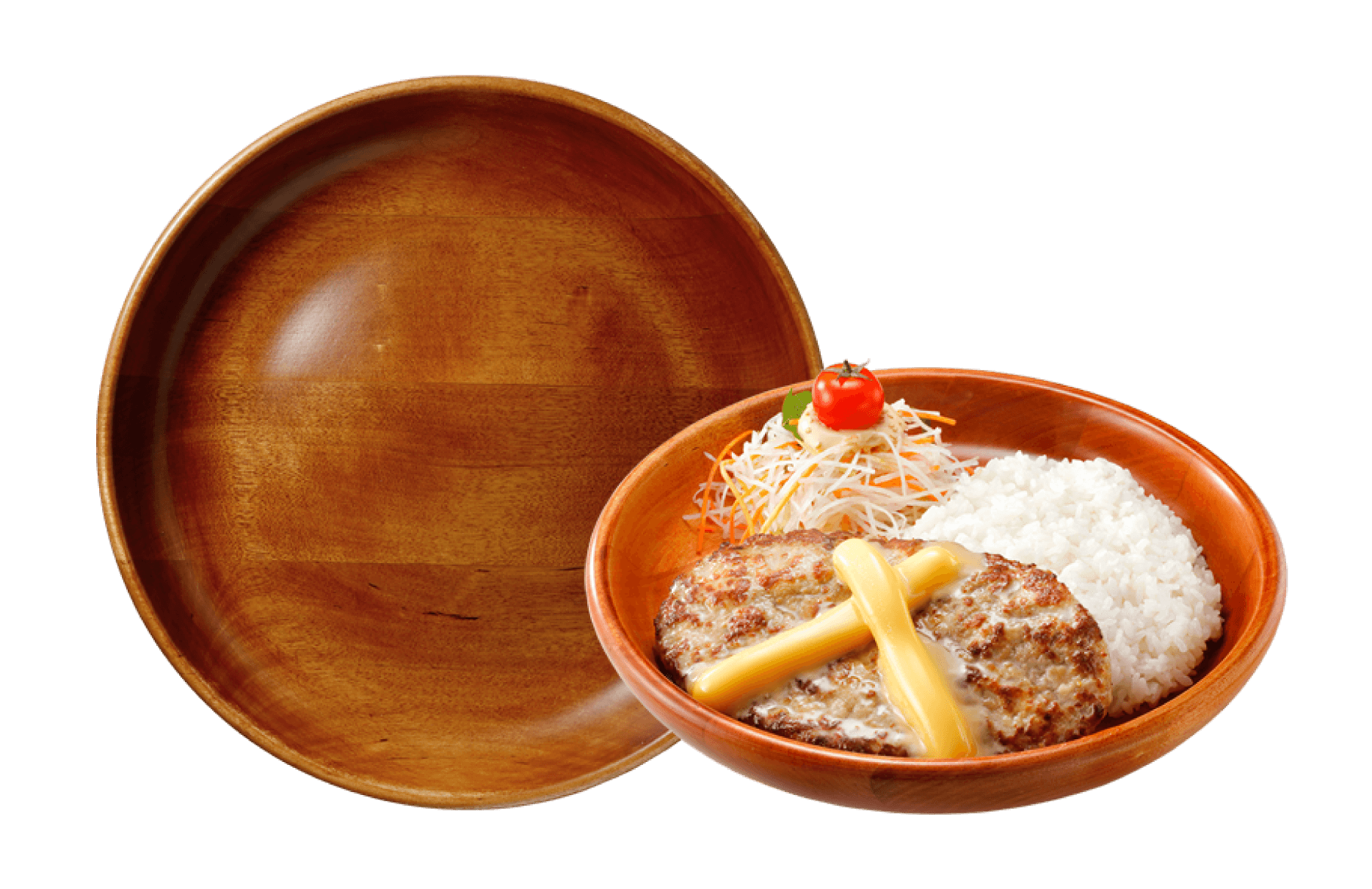 ハンバーグディッシュでおなじみの木製の皿は、主に樹液が取れなくなったタイ産ゴムの木の老木などを使用しています。また、傷ついたお皿は捨てず、削り直して、リユースしています。